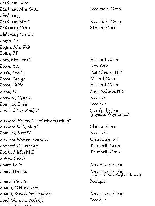 Alphabetical listing of over 1,000 out-of-town visitors to the New Milford Bicentennial Celebration held June 15 - 18, 1907. An 8 x 11, 37-page booklet |